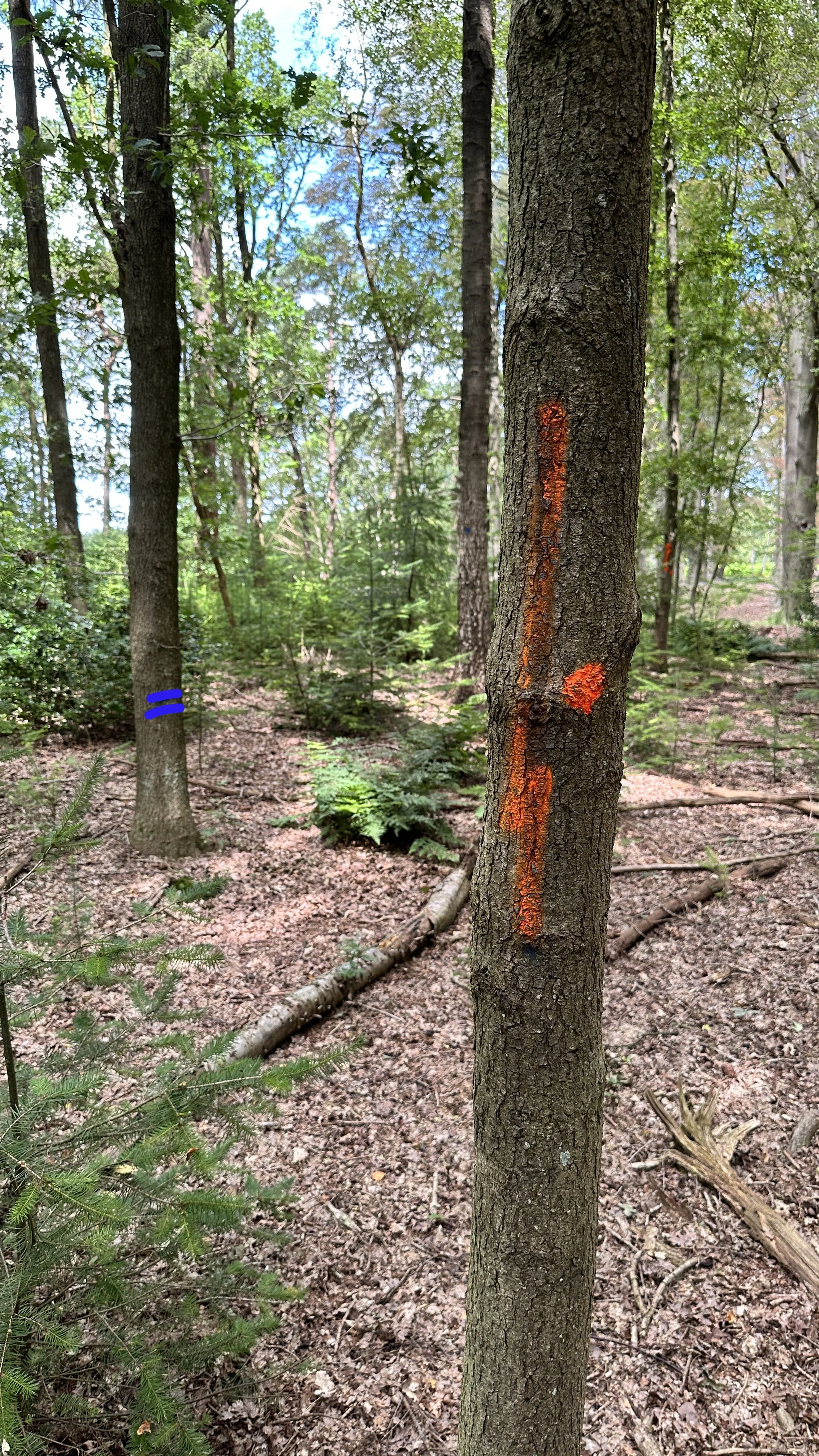 Door deze markeringen kunnen de houthakkers zich goed oriënteren en kunnen oude ruimingspistes later nog terug worden gevonden. Bomen met een verticale streep | staan op het rijpad van de bosbouwmachines en moeten worden geveld (omgezaagd) om de weg vrij te maken.