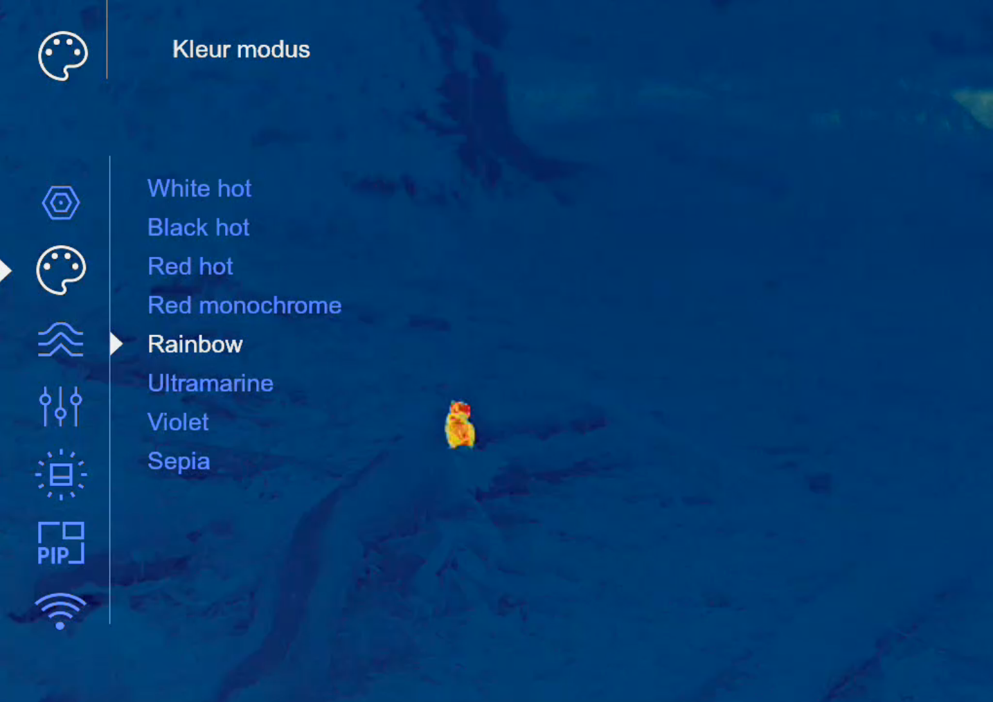 In het menu van de TELOS XP50 kan je bij Kleur modus verschillende kleuren instellen, In de meeste gevallen werkt White hot bij mij het beste om duidelijk waar te nemen. Op sommige momenten als veel struiken en boomstammen wit kleuren dan kan je beter waarnemen met bijv. Red monochrome.