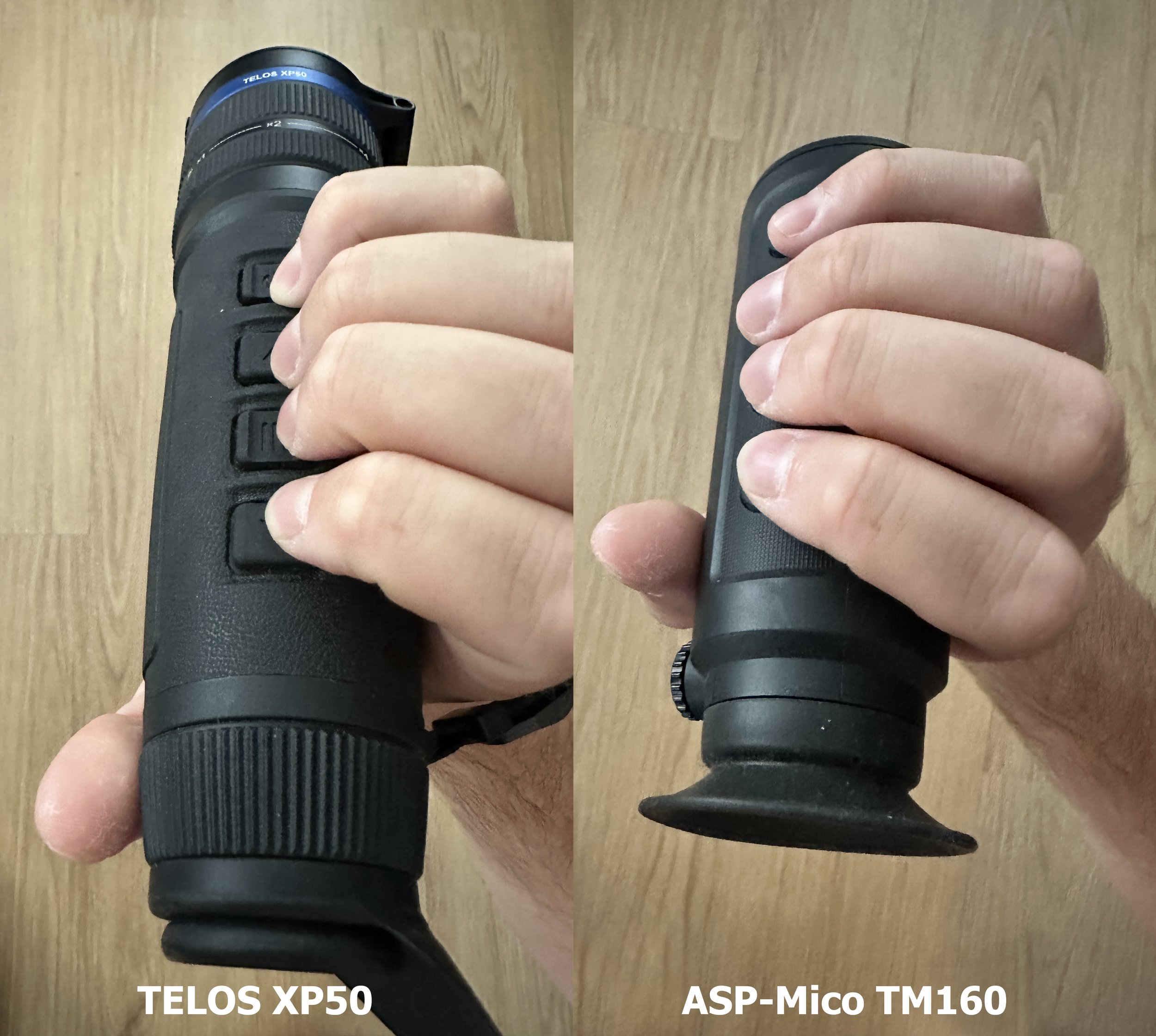 Tijd voor de vergelijking met deze ASP-Mico TM160 die duidelijk meer “feels great in the hand” heeft in vergelijking met de Dure TELOS. De knoppen van deze warmtebeeldcamera zijn zo fijn in te drukken. Dikke plus.